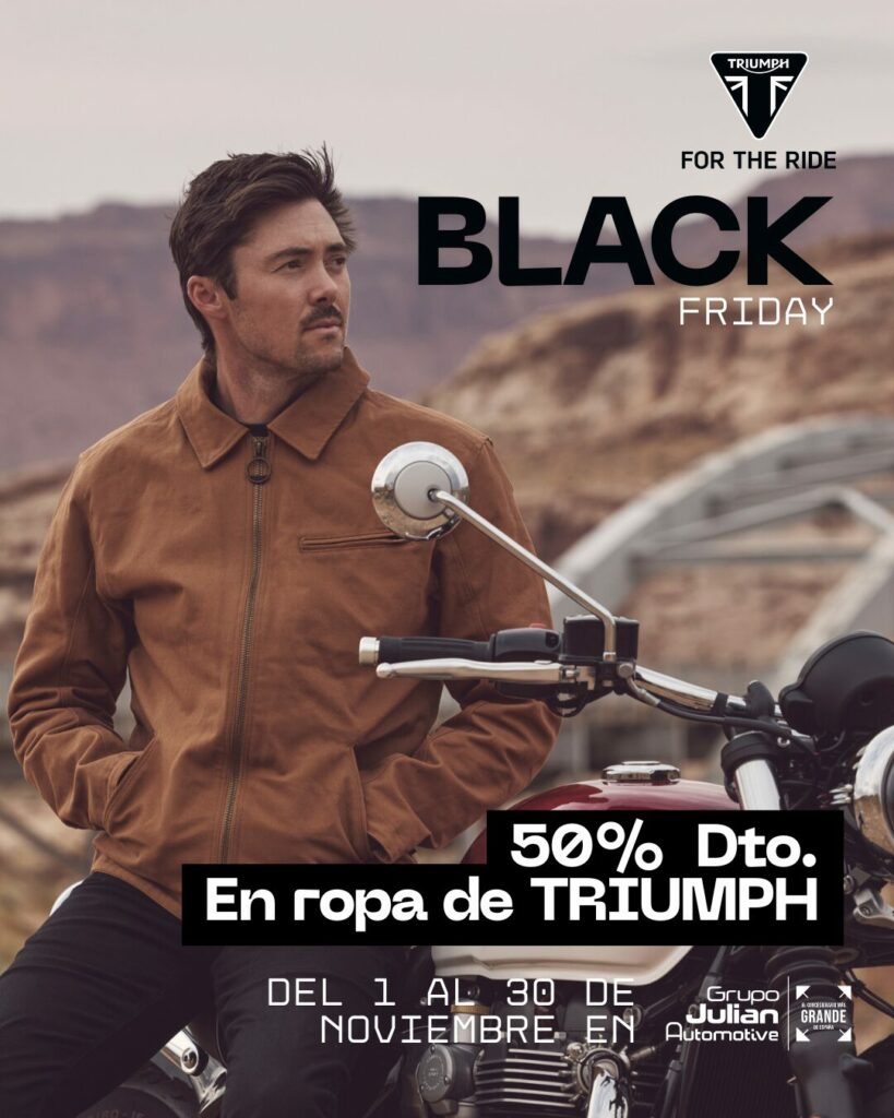 El Black Friday Triumph en Grupo Julián 2025 llega con fuerza y con los mejores descuentos del año para los apasionados del mundo de las motos. Si te encanta la marca británica Triumph, esta es tu oportunidad para equiparte con estilo: ¡disfruta de hasta un 50% de descuento en ropa y accesorios oficiales solo hasta el 30 de noviembre!